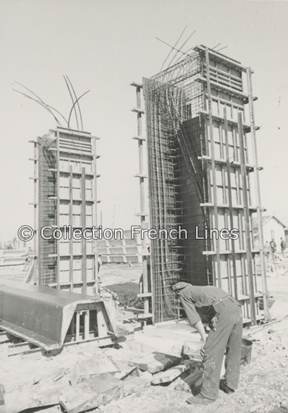 Construction de la nouvelle gare maritime de la Compagnie Générale Transatlantique au Havre, le 14 septembre 1951, armature du poteau 36.