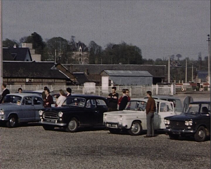 Autre rallye - homme se tenant près d'un calvaire - femme avec un appareil photo (gros plan) - église - prairie avec vaches - arbres en fleurs - ferme - château avec son portail - cour du château de Brémontier-Merval - grand barbecue - cuisiniers - affiche "16 Mai 1965, Grand Rallye Cochon suivi du menu" - repas (sombre) - vue de la façade un L et un panier sont en brique rouge - la cheminée - jeu : entourer de bandages des personnes de la tête au pied.