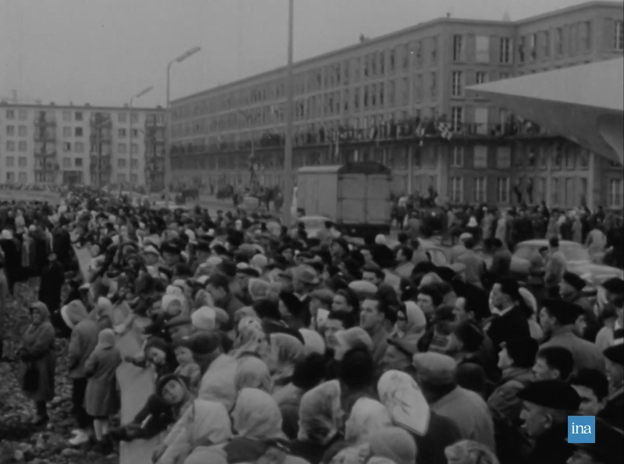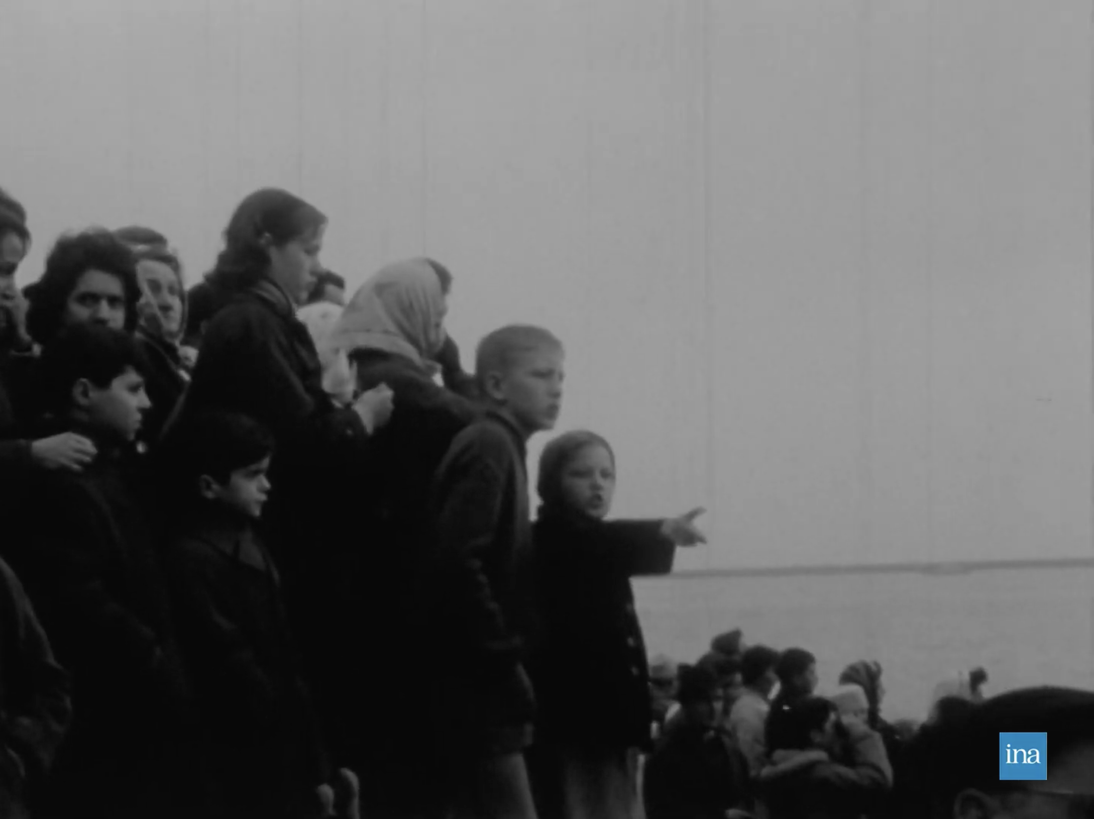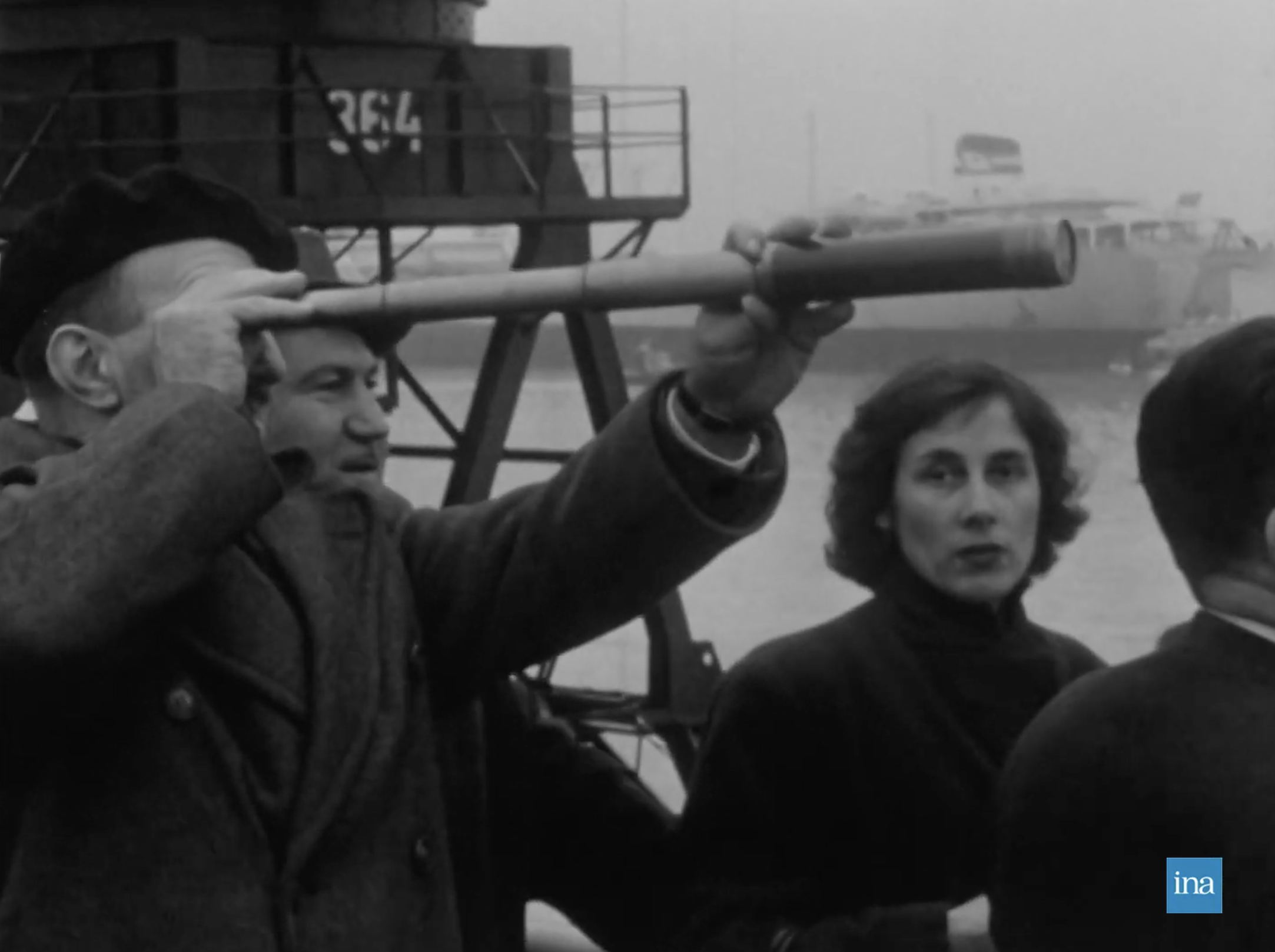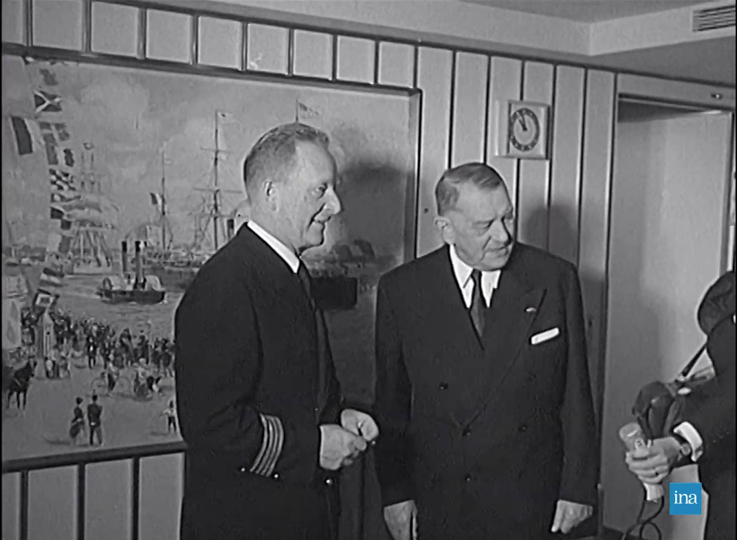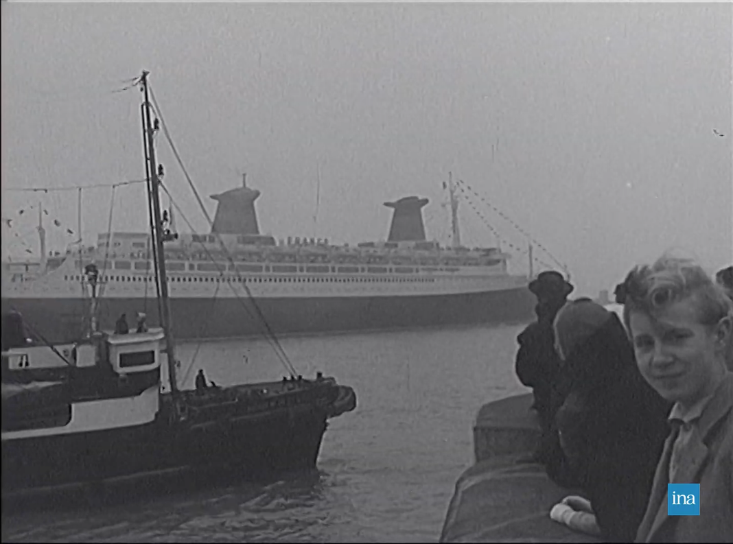 Photogrammes issus de Arrivée du paquebot France au Havre, son port d'attache, 23/11/1961, Collection INA (CAF96077615).