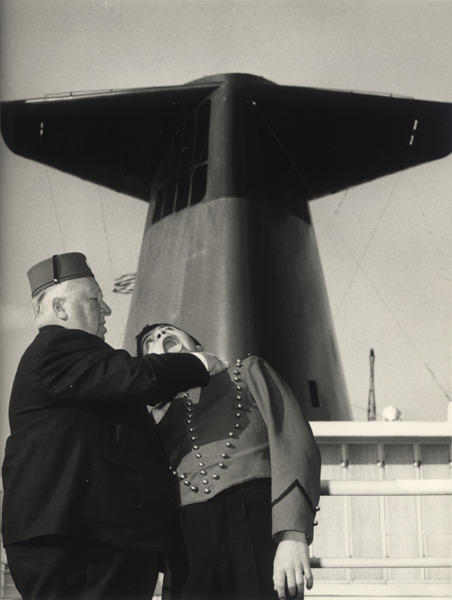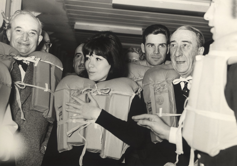FL005650 Alfred Hitchcock avec un groom à bord du France (CGT 1962), FL006528 Juliette Gréco pendant un exercice de sécurité à bord du France (CGT 1962) et FL006546 spectacle de Johnny Hallyday France (CGT 1962), Collection French Lines & Compagnies.