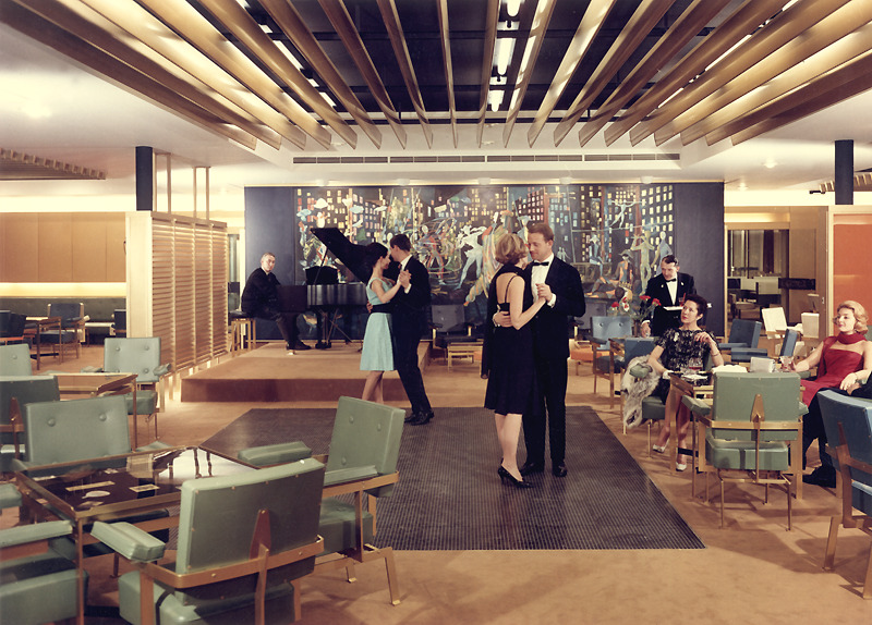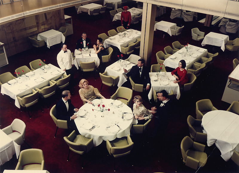 A gauche : FL004981, Salle à manger classe touriste, Chevojon / À droite : FL003529, Fumoir de la classe touriste à bord du paquebot France (CGT 1962), La Photothèque, Collection French Lines & Compagnies.