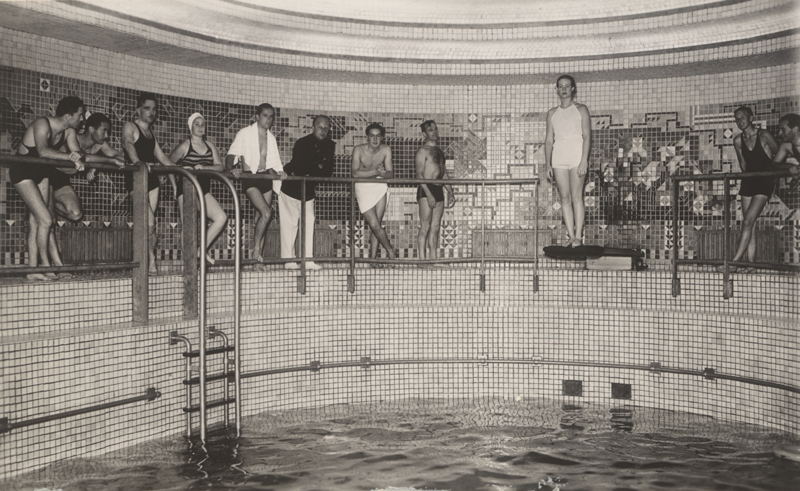 Piscine première classe, vue de la double corne d'abondance de Chauvin ; La piscine de première classe à bord de Normandie (CGT 1935) Collection French Lines & Compagnies (FL006670, FL005407 et FL006672).