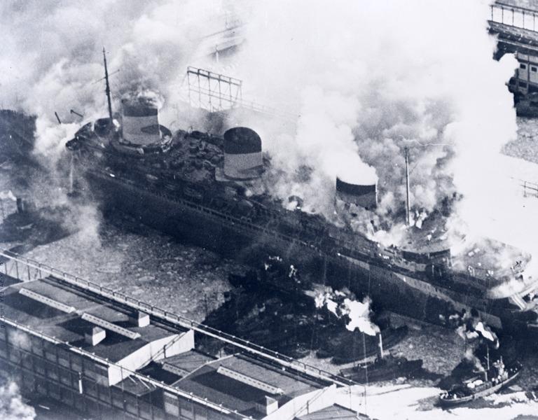 L’incendie du paquebot Normandie (CGT 1935) à New York le 9 février 1942, Collection French Lines & Compagnies (FL011709).