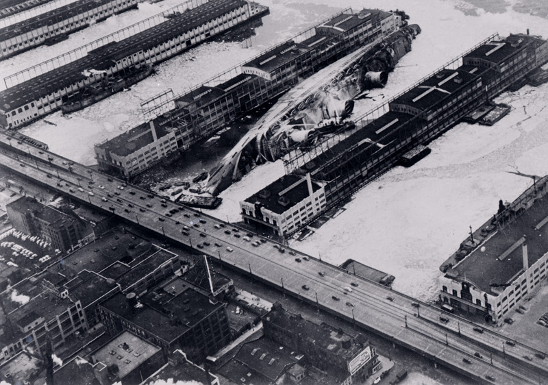 L'incendie du paquebot Normandie (CGT 1935), couché, vu du ciel, Collection French Lines & Compagnie (FL011708)